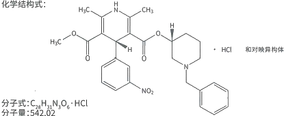 化学名称:3-[(3RS)-1-苄基哌啶-3-基]-5-甲基(4RS)-2,6-二甲基-4-(3-硝基苯基)-1,4-二氢吡啶-3,5-二羧酸盐酸盐。